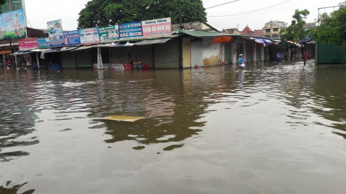Theo ghi nhận của phóng viên, tại khu vực chợ Hương Dũng, TP Vinh nước ngập sâu khiến hoạt động kinh doanh, buôn bán của tiểu thương bị ngưng trệ.
