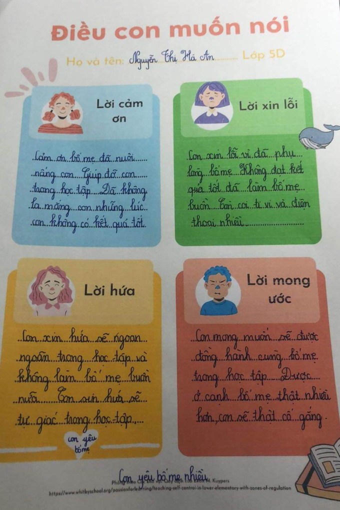 Đến ngày họp, các phụ huynh sẽ được nhận các dòng tâm sự, gửi gắm của các con trong các phiếu. Chị Hằng, một phụ huynh, chia sẻ: "Quá bất ngờ luôn. Thường ngày, tôi không có thời gian hay cơ hội để được nghe con nói, tậm sự như thế này. Nhờ vậy mà tôi hiểu hơn được con mình".