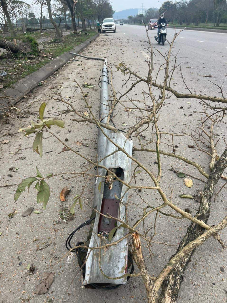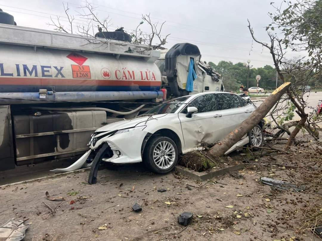 Trước khi đâm xe ô tô con, xe bồn còn húc bay nhiều cây bên đường