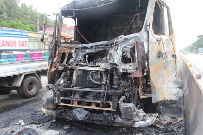 Chiếc xe tải đang lưu thông bỗng phát ra tiếng nổ, sau đó bùng cháy dữ dội. Ngọn lửa thiêu rụi phần đầu chiếc xe chỉ còn trơ lại khung sắt.