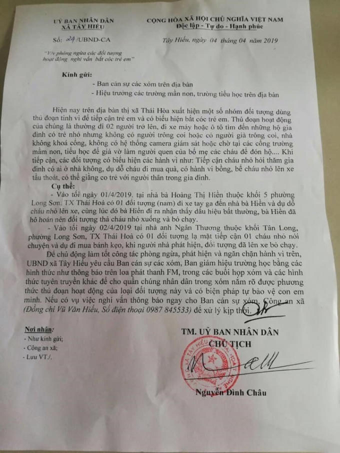 Chiều ngày 8.4, ông Phạm Văn Huy - Trưởng Công phường Long Sơn, thị xã Thái Hòa, Nghệ An, cho biết: “Trên địa bàn xuất hiện một nhóm đối tượng dùng thủ đoạn tinh vi để tiếp cận trẻ em và có biểu hiện nghi vấn bắt cóc trẻ em”.