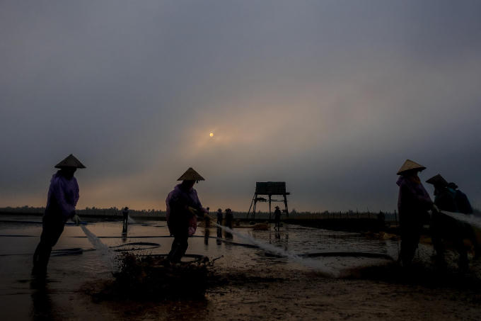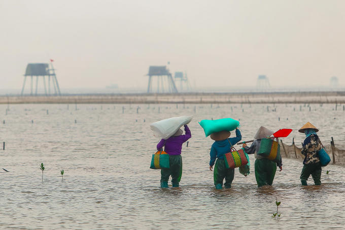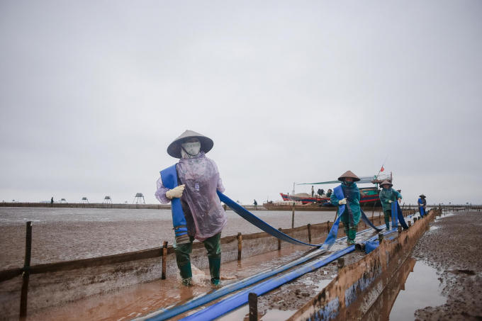 Một không gian nhộn nhịp trên cánh đồng ngao. Những người dân làm việc hăng say và tập trung để đảm bảo năng suất đạt tốt nhất. Những hạt mưa lớt phớt rơi trên mặt không làm ảnh hưởng tới những người lao động cần mẫn. Ngao được gom vào lưới, buộc chặt rồi khiêng lên tàu.