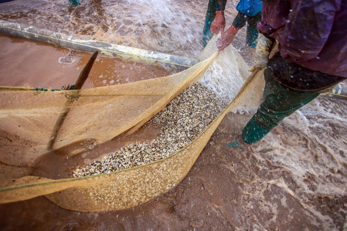 Khi lớp cát phủ dần trôi đi sau những đợt phun nước liên tiếp, các con ngao trắng dần hiện ra. Lúc này, người dân sẽ dùng lưới quây để bắt.