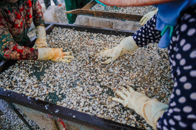 Sau khi được đưa lên tàu, người ta đổ ngao ra sàn, phun nước rửa thêm lần nữa rồi đưa lên sàng lọc, phân loại theo kích cỡ. Tiếng cười nói giữa người làm và chủ tàu phần nào đó giảm đi sự mệt mỏi của công việc, tạo không gian thoải mái và rút ngắn khoảng cách giữa chủ và người làm thuê gần hơn. “Anh này vào giúp chúng tôi một tay nào”, những người phụ nữ trêu đùa khi thấy phóng viên đứng bên mạn tàu ghi hình.