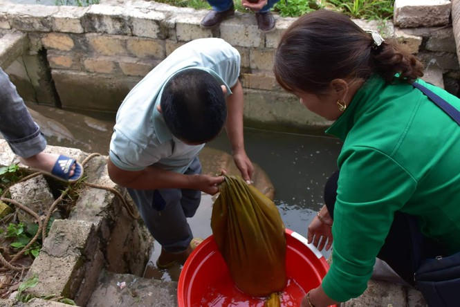 Về quy trình thu hoạch rươi bà Kim chia sẻ, khi rươi nổi nhiều gia đình bà sẽ tháo cống để nước từ ruộng rút từ từ kéo theo rươi chui vào lưới được đặt sẵn tại cửa cống trước đó. Sau khi kéo lưới lên, rươi được trút sang những chậu nhựa to để rửa bằng nước sạch. Rươi sau khi được rửa qua 3 – 4 lần nước và để ráo sẽ được đóng vào hộp nhựa. Thông thường, hộp rươi đóng sẵn được chia thành hai loại 0,5 kg và 1kg trước khi chuyển cho các mối buôn.