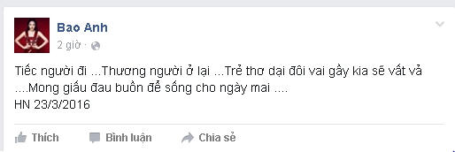 Sáng nay, Bảo Anh đã có mặt từ rất sớm tại nhà tang lễ Bộ Quốc Phòng để nói lời tạm biệt cuối cùng với người thầy thân yêu của mình. Nữ ca sĩ đau xót: "Tiếc người đi... Thương người ở lại... Trẻ thơi dại đôi vai gầy kia sẽ vất vả.... Mong giấu đau buồn để sống cho ngày mai..."
