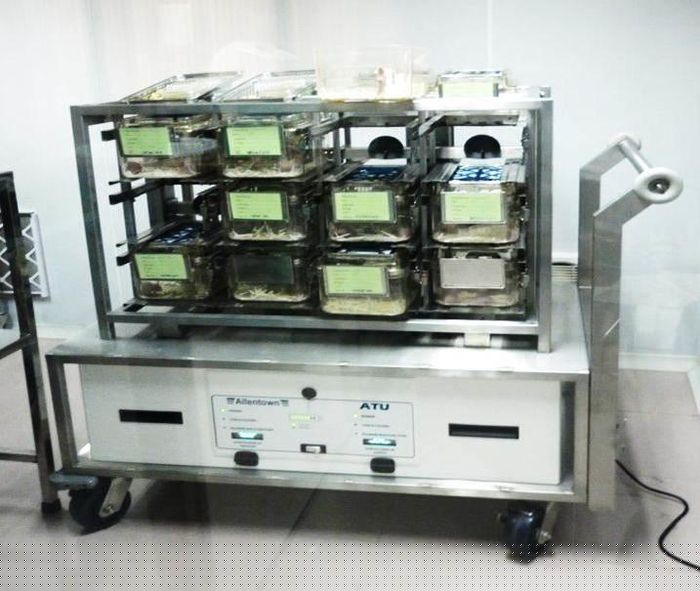 Chuột thí nghiệm được nuôi trong lồng có lỗ cấp và thoát khí qua màng lọc HEPA, không khí được lọc và có áp lực dương tính