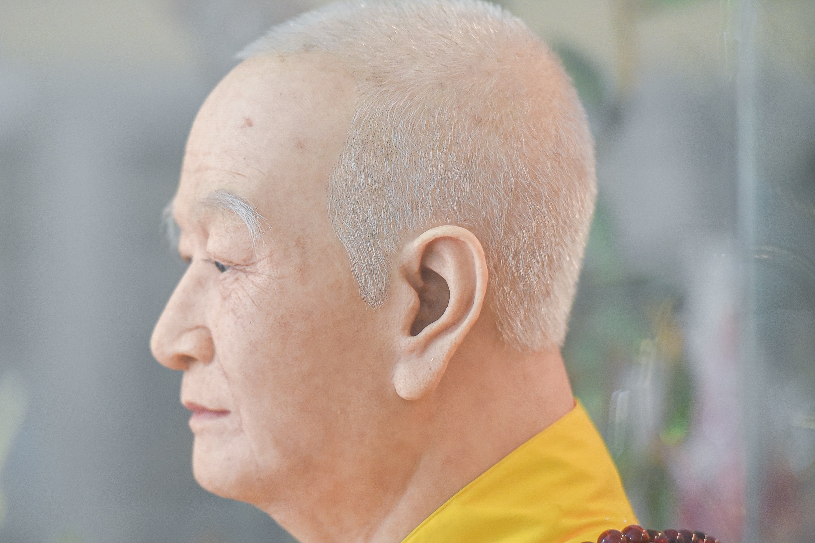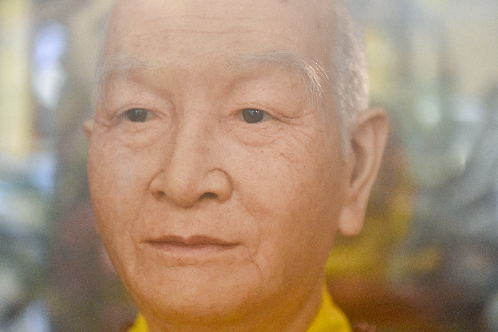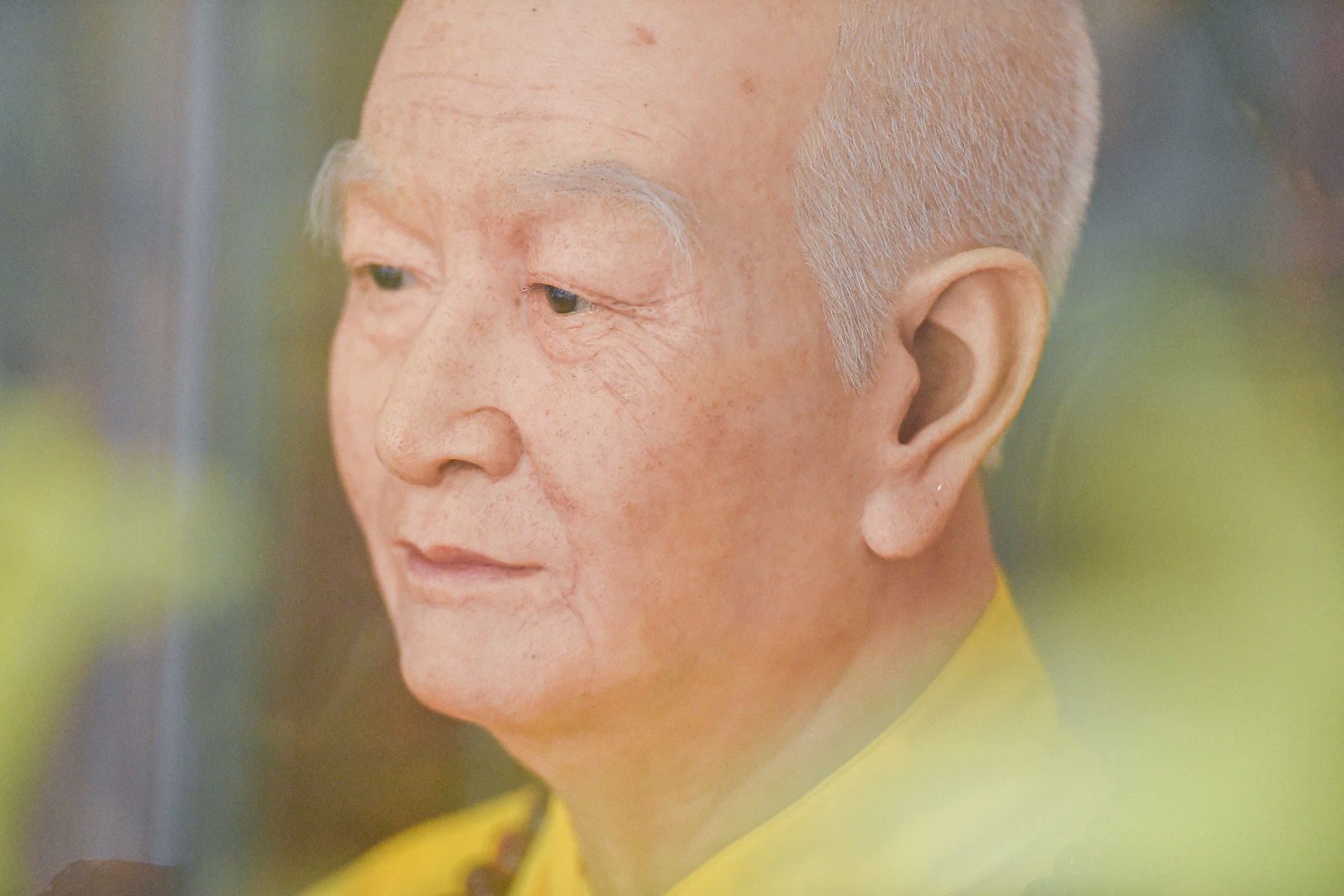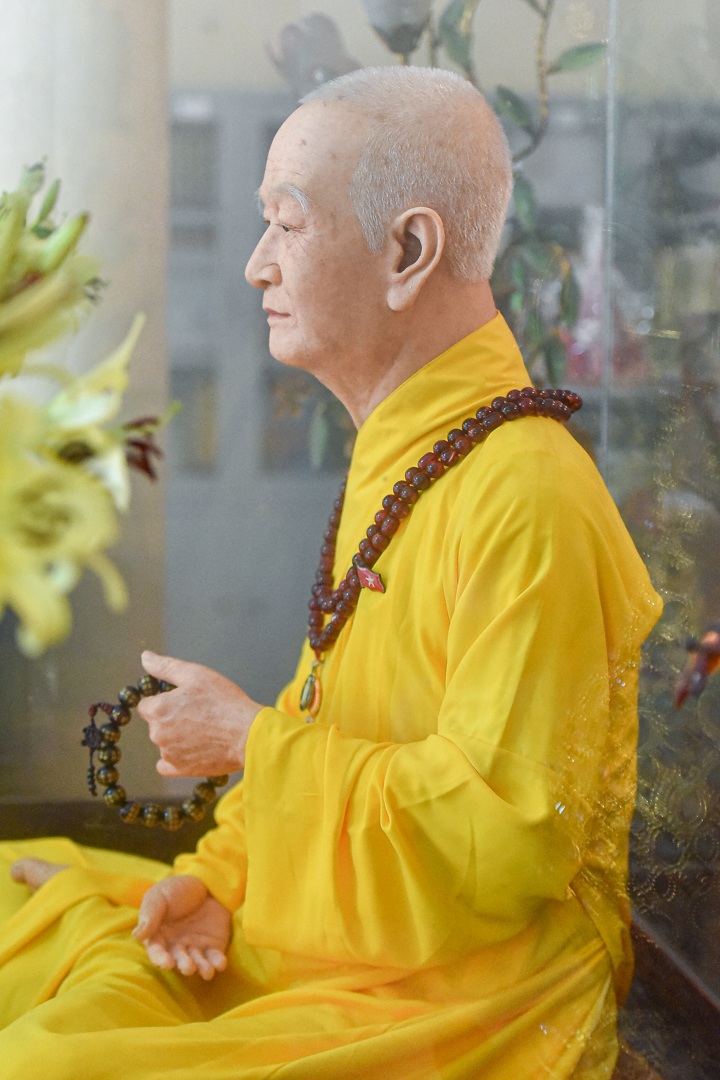 Bức tượng sáp giống y thật tới từng chi tiết nhỏ nhất là nốt ruồi, những nếp nhăn trên khuôn mặt cố Đại trưởng lão Hòa thượng Thích Thanh Tứ.
