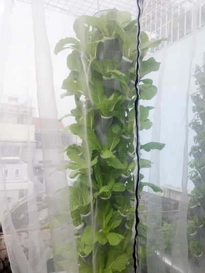 Chỉ sau một tháng trồng, rau muống, rau cải... đã mọc xanh mơn mởn, phủ kín các trụ cao 1,9m của nhà anh Sơn, ở quận Gò Vấp, TP Sài Gòn.