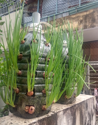 Ngoài rau trồng khí canh, anh Sơn còn làm thêm những bình trồng hành ngộ nghĩnh.