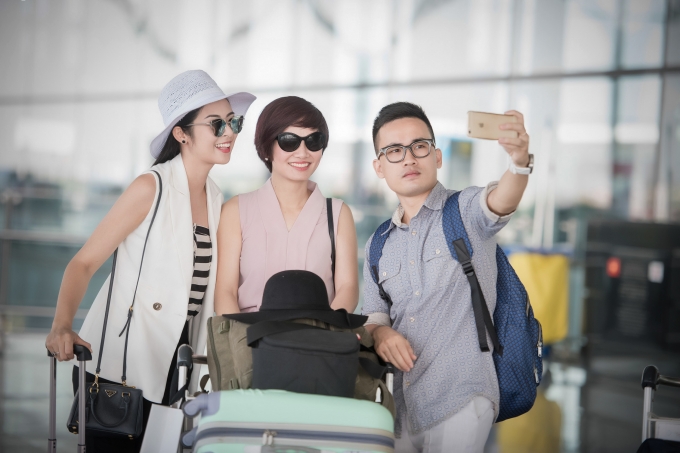 Không lộng lẫy như tại các sự kiện, khi xuất hiện ở sân bay, Ngọc Hân chọn style ăn mặc trẻ trung, mix cây trang phục đen - trắng cùng mũ rộng vàng và mắt kính sành điệu. Cô cũng chăm chút để bố mẹ luôn chỉn chu về ngoại hình mỗi lần đi nước ngoài với con gái.