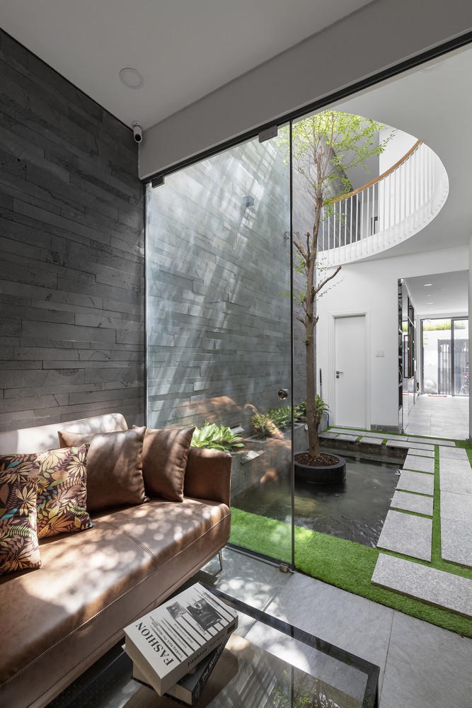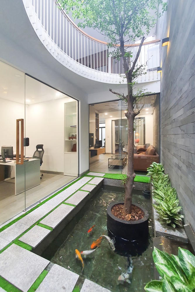 Chủ nhà là người làm trong nghề thiết kế, vậy nên ngoài không gian để ở anh còn ưu tiên bố trí văn phòng tại nhà. Phía trước là một khoảng sân trước đủ rộng để cho nhân viên và khách hàng đậu xe.