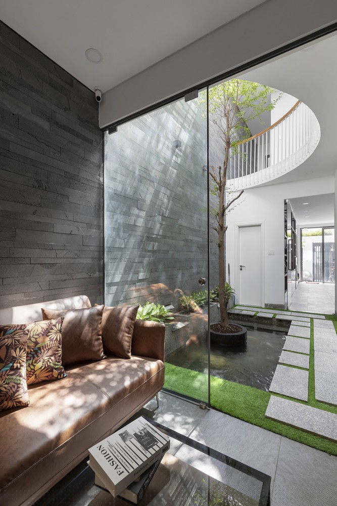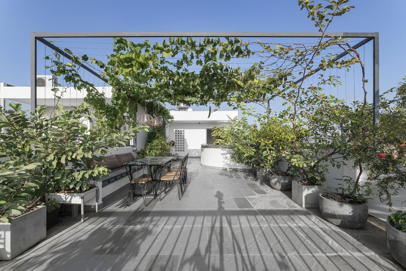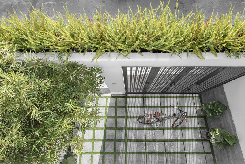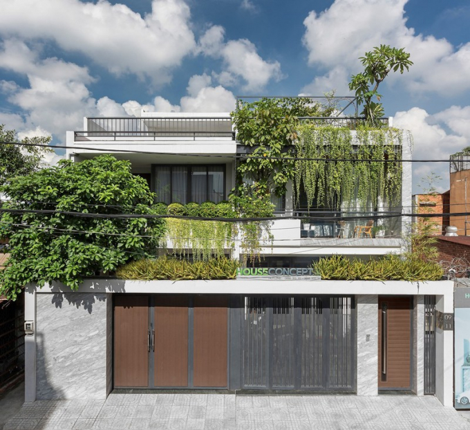 Mặt tiền ngôi nhà được phủ bằng một tấm rèm tự nhiên, nhằm giảm bớt cái nắng nóng và oi bức của phố thị