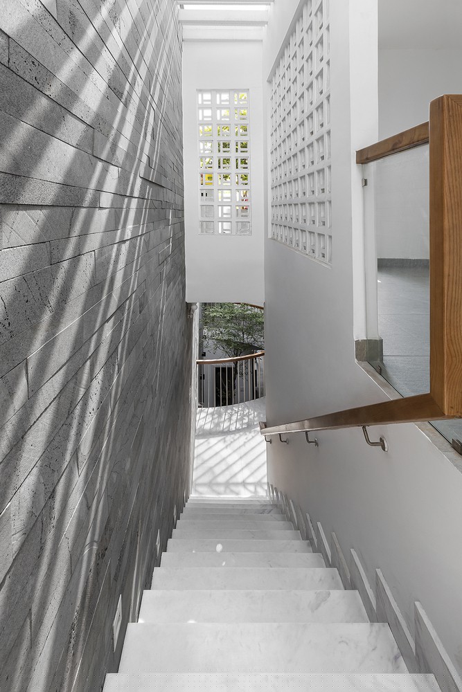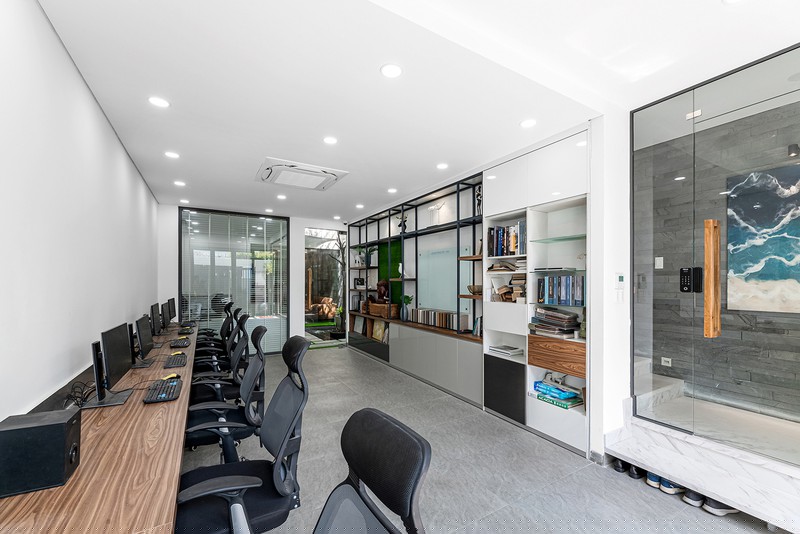 Khu vực làm việc của nhân viên trong công ty. Dù đảm nhận nhiều chức năng nhưng vì muốn có sự phân tách rạch ròi nên cầu thang được bố trí ngay cạnh cửa, ngăn cách lối đi lại của các thành viên trong gia đình và nhân viên.