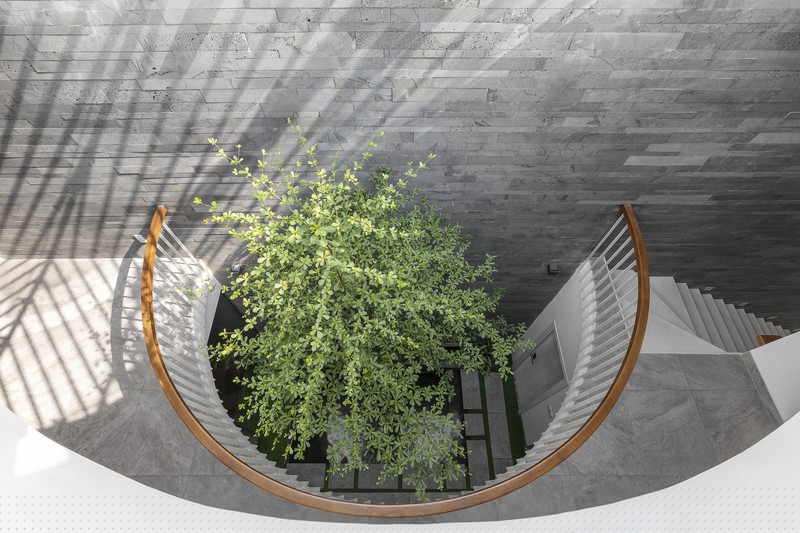 Một cây lớn mọc thẳng từ dưới lên tạo bóng mát cho các phòng xung quanh.
