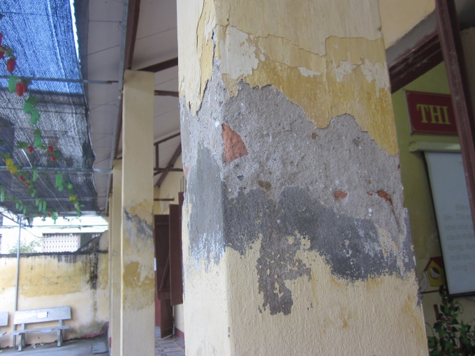 | Các cây cột và bức tường bị bong tróc, có nguy cơ đổ gãy bất cứ lúc nào. Ảnh: Nguyệt Chi |