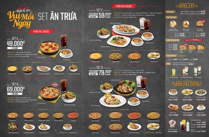 Tự chọn phần ăn theo ý thích từ hơn 100 lựa chọn hấp dẫn (Pizza, Mì Ý, Cơm, Khai vị, Nước) trong Menu mới của Pizza Hut. Khuyến ma