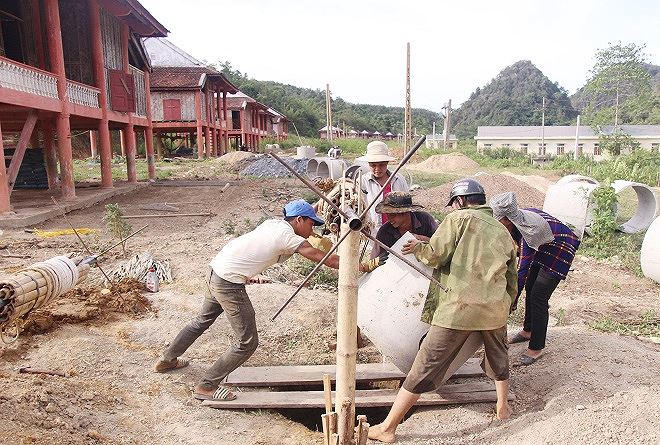 Chính quyền cùng các lực lượng hỗ trợ đào giếng để lấy nước phục vụ các hộ dân nơi ở mới.