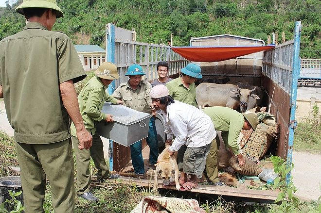 Những tài sản của người dân được một tổ công tác bốc xếp gọn gàng lên những chiếc xe ô tô tải chờ sẵn, còn một phần lớn người dân xe máy vào tận bản làng để chở người dân trở ra trung tâm điểm tập kết.