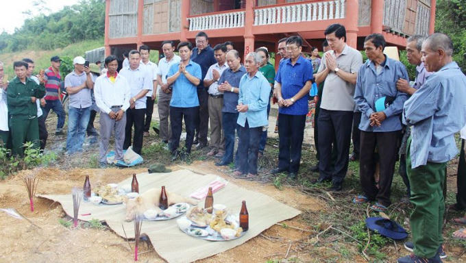 Bí thư Huyện ủy cùng già làng trưởng bản thực hiện lễ cúng cầu mong bình an nơi vùng đất mới để người dân nhập trạch.