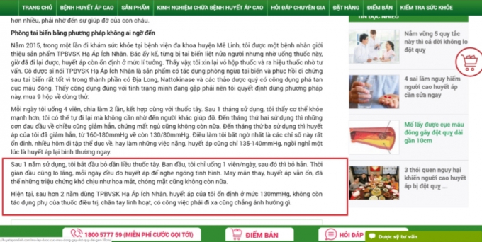 Tuy nhiên, tại website: https://huyetapondinh.com/ và một số trang mạng xã hội khác lại đăng tải nhiều bài viết, chia sẻ của khách hàng về sản phẩm Hạ Áp Ích Nhân. Nội dung các bài viết này có chung một nội dung: Khách hàng bị cao huyết áp, dùng thuốc tây nhiều năm, thậm chí còn bị tai biến mạch máu não nhiều lần do cao huyết áp; nhưng chỉ cần uống Hạ Áp Ích Nhân một thời gian là tự ý giảm dần và bỏ hẳn thuốc huyết áp tây y, chỉ cần dùng Hạ Áp Ích Nhân mà vẫn khỏe.