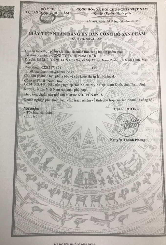 Theo Giấy tiếp nhận đăng ký bản công bố sản phẩm số 8394/2019/DKSP, do Cục ATTP (Bộ Y tế) cấp ngày 28/06/2019, thì sản phẩm Hạ Áp Ích Nhân là Thực phẩm bảo vệ sức khỏe của Công ty TNHH Nam Dược tại Lô M13 (C4-9) KCN Hòa Xá, Xã Mỹ Xá, TP. Nam Định, Tỉnh Nam Định sản xuất. Được phân phối bởi Công ty TNHH Dược phẩm Ích Nhân (địa chỉ: Lô A18/D7, Đô thị Cầu Giấy, Phường Dịch Vọng, Quận Cầu Giấy, Hà Nội).
