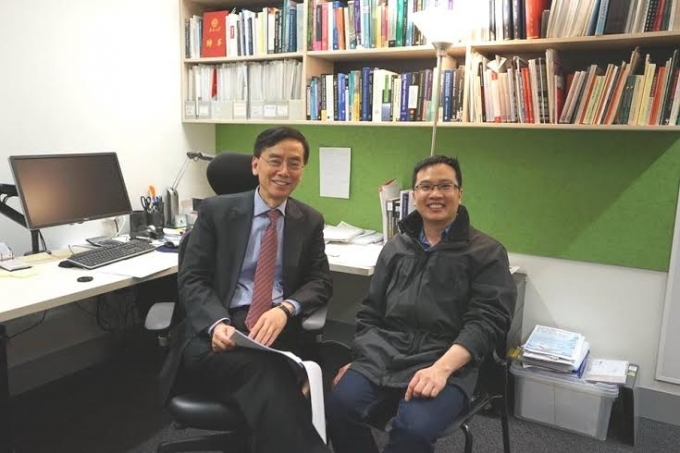 | TS. Hòa trao đổi về nghiên cứu với Giáo sư On Kit Tam tại Đại học RMIT. |