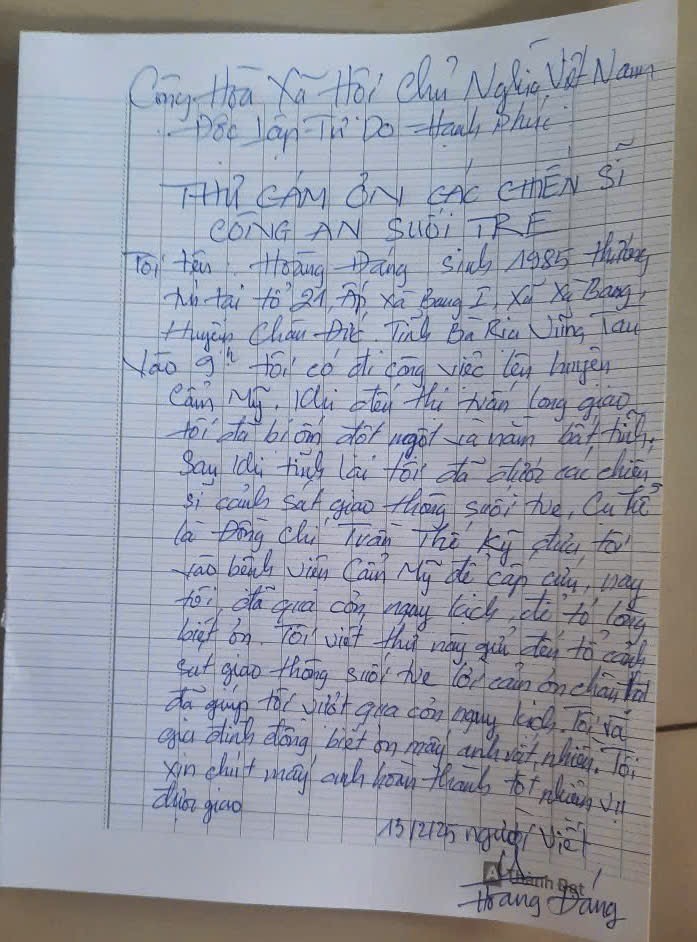 Ông Hoàng Đáng chia sẻ, trong thư cảm ơn, không chỉ riêng ông mà cả gia đình ông đều rất xúc động và biết ơn sự dũng cảm, nhiệt tình của các chiến sĩ cảnh sát giao thông đã sẵn sàng giúp đỡ người dân trong hoàn cảnh khẩn cấp.
