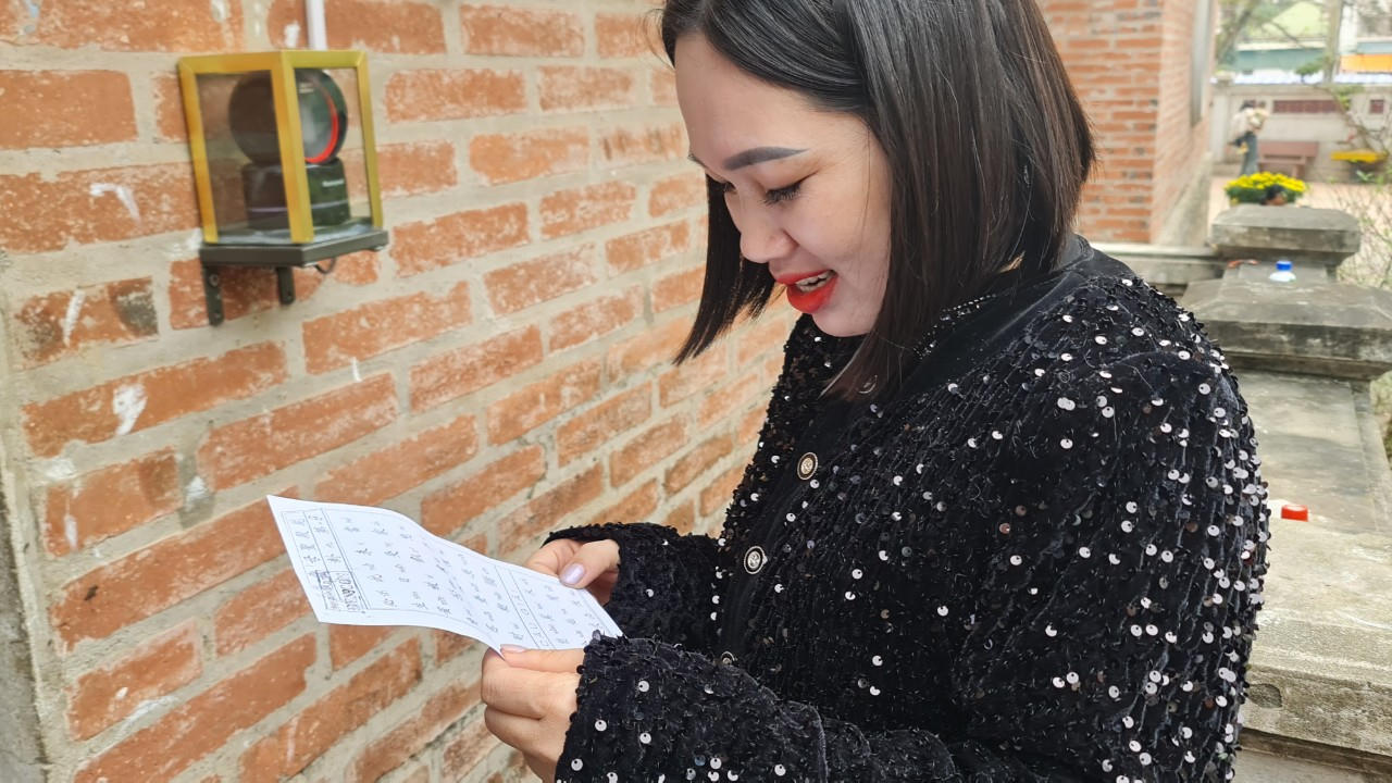 Một du khách vui sướng khi bốc được quẻ tốt đầu năm.