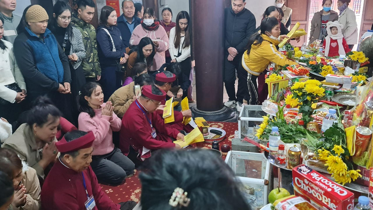 Khu vực bên trong Đền Cờn chật kín người dâng lễ.