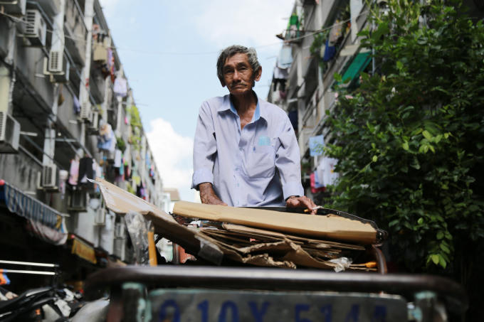 "Hồi đầu tôi định phụ phát cơm làm phước để con tôi bớt bệnh, nhưng người ta biết hoàn cảnh, người ta thương rồi người ta cho cơm mình mang về ăn. Có đợt tui đi phát cơm bị người ta tông xe rồi bỏ chạy, may mà được người tốt đưa vô bệnh viện còn đóng luôn viện phí cho tôi. Tối về tôi giữ xe dưới chung cư, người ta ứng trước cho tôi 1 triệu/tuần để tôi trang trải. Thật ra tiền công chỉ có 700 nghìn đồng/tuần à, mà tôi quét dọn rác khu vực nên được trả thêm 300 nghìn nữa", ông kể.