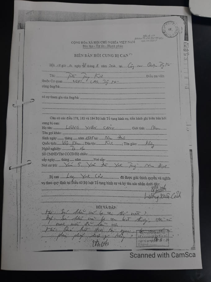 Tiếp đến là biên bản hỏi cung bị can ngày 28/2/2020, do Điều tra viên Trần Trung Kiên – Cơ quan cảnh sát điều tra công quận Tây Hồ đã tiến hành hỏi cung, thời gian bắt đầu từ 10 giờ 00 phút ngày 28/8/2020 và kết thúc vào hồi 11 giờ 00 phút ngày 28/8/2020.