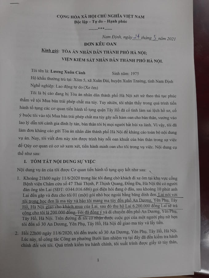 Liên quan đến vụ án, ông Lương Xuân Cảnh (SN 1975, ở xã Xuân Đài, huyện Xuân Trường, tỉnh Nam Định) hành nghề xe ôm, bị cơ quan tiến hành tố tụng quận Tây Hồ kết án vì có hành vi “Mua bán trái phép chất ma tuý”.