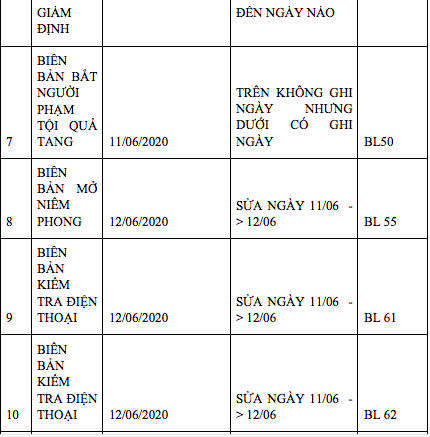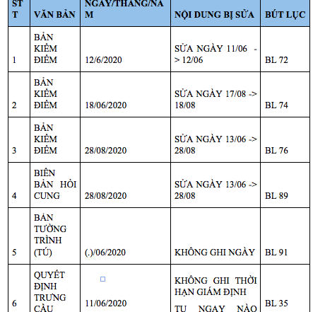 Bảng thống kê những bút lục có dấu hiệu sửa chữa, tẩy xóa thông tin, tài liệu có trong hồ sơ vụ án.