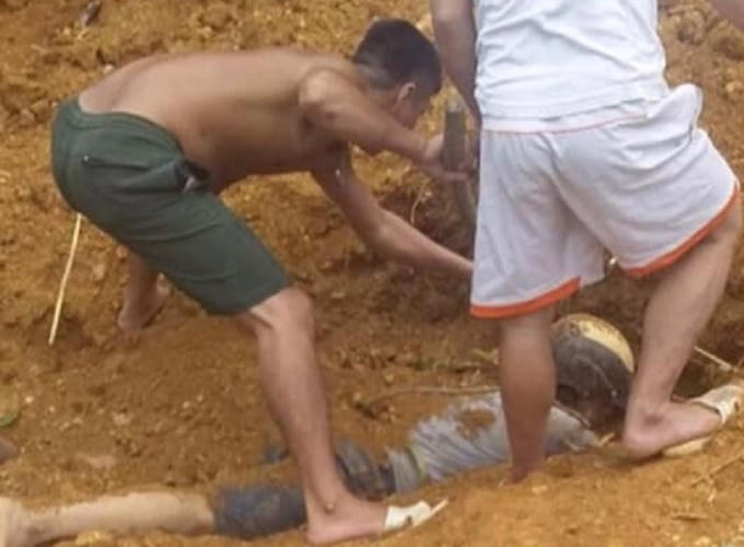 Một người đàn ông bị đất vùi lấp được phát hiện sau đó nhiều người đã cùng đào bới đất cứu thành công người đàn ông này.