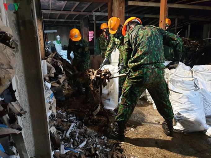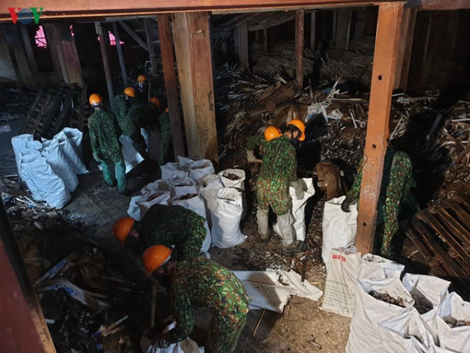 Lực lượng quân đội tiến hành thu gom và tẩy độc bên trong nhà máy Rạng Đông.