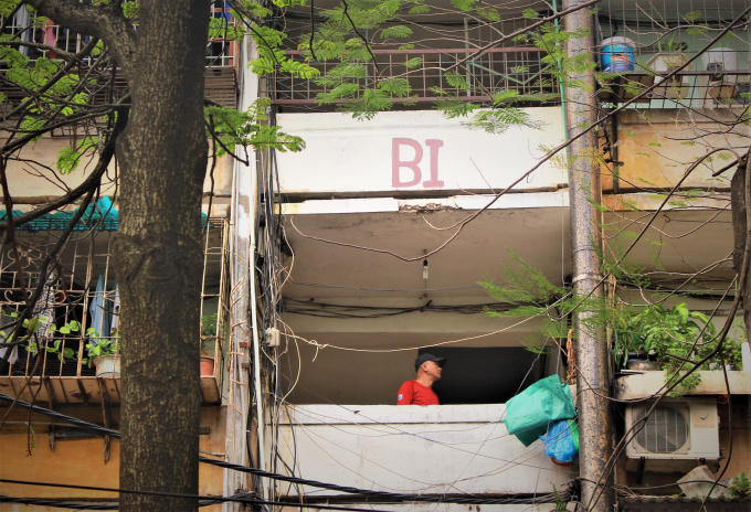 Chung cư, nhà tập thể cũ tại khu tập thể Giảng Võ bị bủa vây bởi chuồng cọp, dây điện chẳng chịt và sự xuống cấp.
