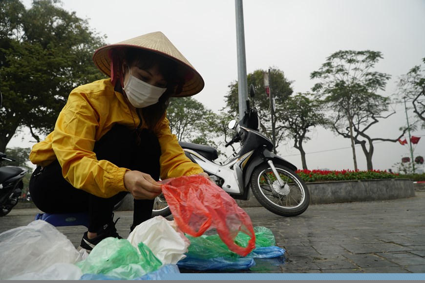 Chị Nguyễn Vũ Ngọc Bích (Trung tâm Thiện Tâm An) đang làm công việc thu gom rác thải nilon từ người dân xả ra khi thả cá tại 1 điểm khu vực Hồ Tây. Chị cho biết chị đã làm việc thu gom ở đây đã được 7 năm. (Ảnh: PV/Vietnam+)