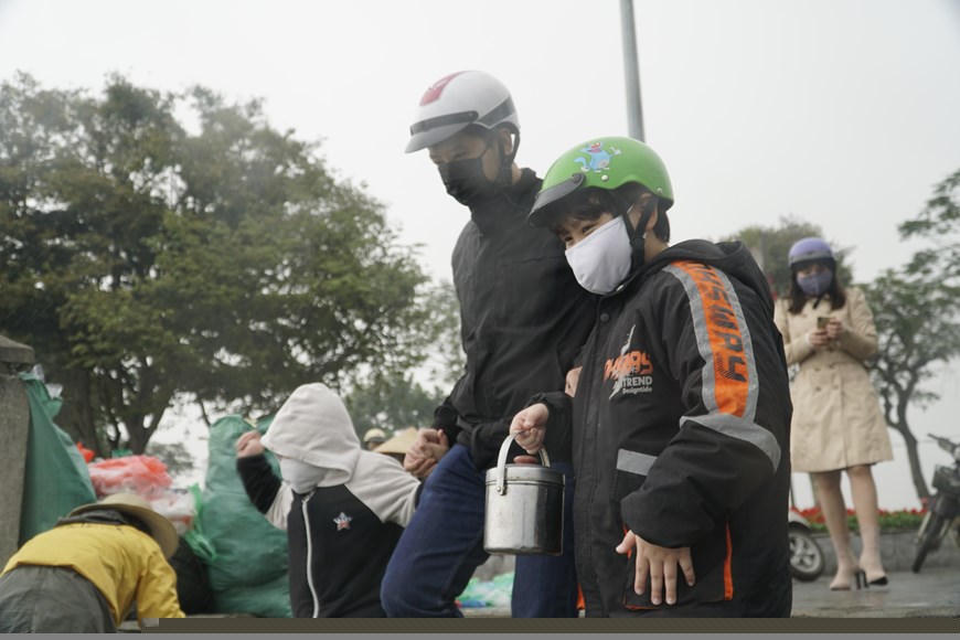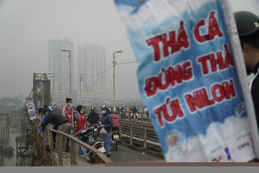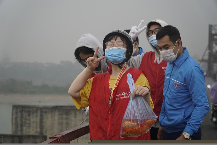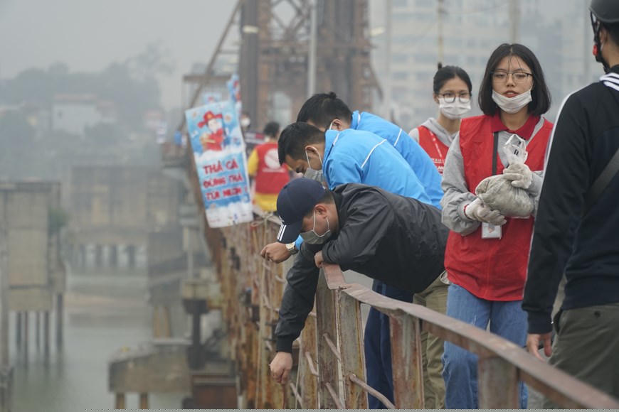 Tại khu vực cầu Long Biên, nhiều bạn tình nguyện viên giúp người dân thả cá an toàn. (Ảnh: PV/Vietnam+)