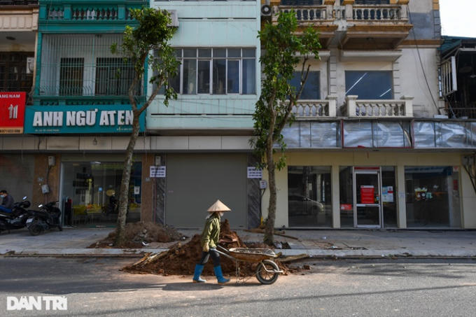 Nhiều công nhân cũng đang gấp rút hoàn thiện việc trồng cây xanh xung quanh 2 bên đường, vì vậy vẫn có tình trạng các ụ đất được đổ ra cạnh vỉa hè.