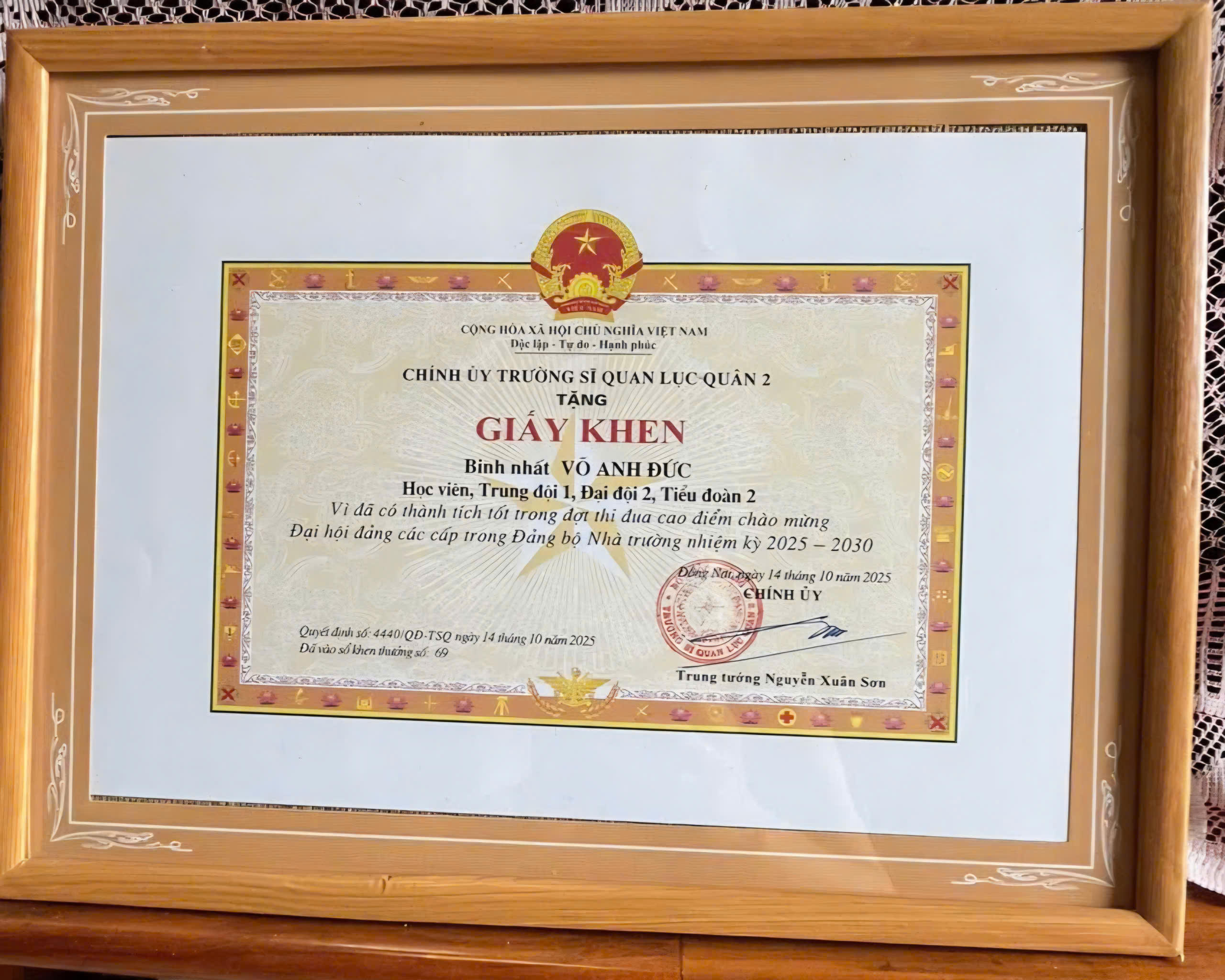 Với Đức, việc học tập và rèn luyện trong quân đội không chỉ là trách nhiệm của riêng mình, mà còn là sự đồng hành cùng đồng chí, đồng đội để cùng nhau tiến bộ. Những cố gắng bền bỉ ấy tiếp tục được ghi nhận bằng Giấy khen của Trường Sĩ quan Lục quân 2 trong đợt thi đua cao điểm chào mừng Đại hội Đảng các cấp nhiệm kỳ 2025 – 2030.