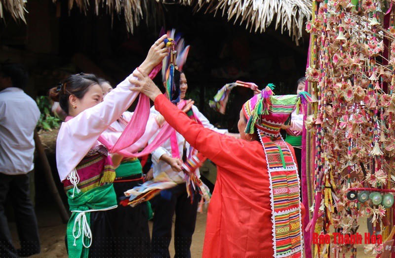 Nghệ nhân Phạm Thị Tắng nói về cây bông bằng một thái độ hết sức tôn kính: “Cây bông này thường chỉ có Ậu Máy mới được truyền lại nghề, rồi sau đó truyền lại cho con cháu, những người cực kỳ khéo tay trong bản Mường. Dưới gốc cây bông, Em Chàng - Bông Danh cùng nàng Chóng Long - Đồng Thiếp ngồi đối xứng với nhau, trùm khăn đỏ, khăn xanh ngồi soi gương lẩm bẩm bài hát, sau đó lại hòa cùng nhịp điệu bài hát, thổi sáo”.