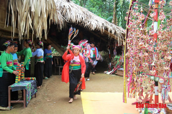 Bên ngôi nhà sàn cổ, khi cây bông được dựng lên, khi tiếng trống, tiếng cồng, tiếng chiêng nổi lên cũng là lúc Máy Tắng cùng đoàn người được tuyển chọn của thôn mang trên mình bộ trang phục đầy sắc màu của người Mường vừa đi vừa nhảy múa vừa hát quanh cây bông. Xen lẫn những điệu múa, lời ca là tiếng cười sảng khoái của Máy Tắng như giục giã, mời gọi mọi người trong bản nhanh chóng tụ hội về quanh cây bông.