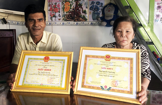 Vợ chồng ông Long cùng giấy khen do UBND phường 1 và TP Cao Lãnh tặng. Ảnh: Hồng Ngự.