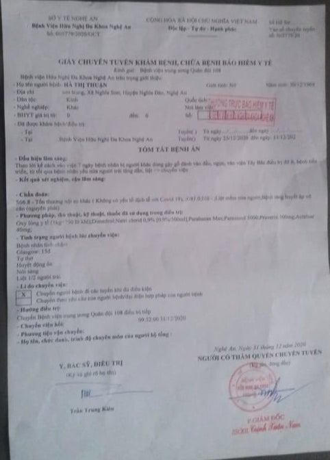 Sau nhiều ngày điều trị, với chấn thương sọ não, liệt nửa người, bà Thuận tiếp tục được chuyển ra Bệnh viện quân y 108 Hà Nội.