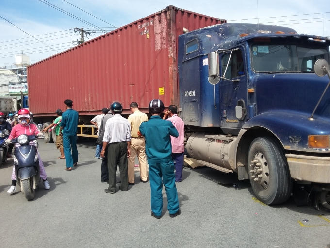 Cú va chạm khiến chị Trang cùng xe máy ngã xuống đường bị xe container cuốn vào gầm. Hậu quả làm nạn nhân tử vong tại chỗ.