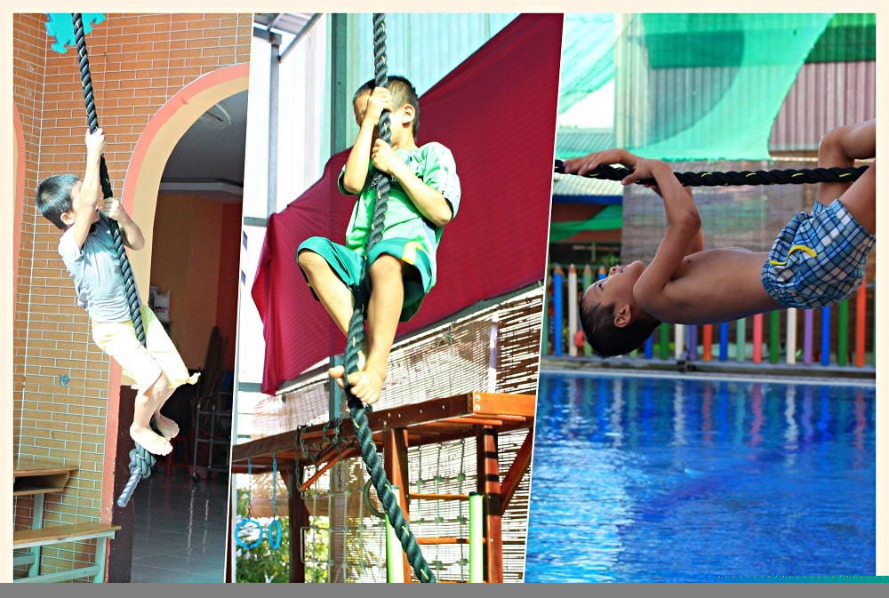Nói xong, ông dẫn chúng tôi ra sân xem các bé biểu diễn đu đây lên tầng cao. Từ trần nhà cách mặt đất 6m, một sợi dây thừng được treo xuống chạm đất. Một cách nhẹ nhàng, các bé chỉ 5 tuổi đu sợi dây rồi trèo lên cho đến khi tay chạm trần nhà mới trèo trở xuống. Ông kể, môn học này, bé gái chưa đầy 6 tuổi luôn là người dẫn đầu.