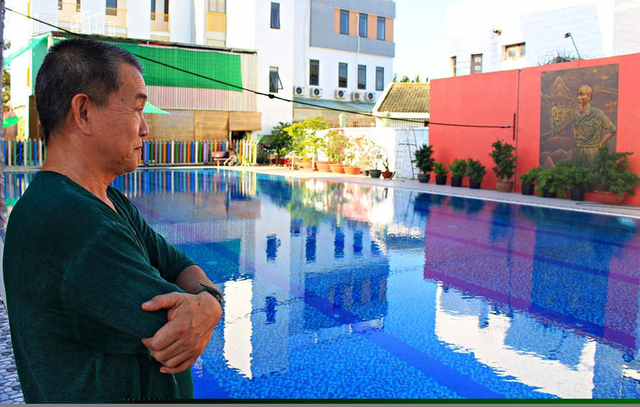 Ông Hiệp giới thiệu hồ bơi theo chuẩn quốc gia được ông đầu tư làm nơi vui chơi, học tập kỹ năng bơi lội cho các bé. (Ảnh: Nguyễn Sơn).