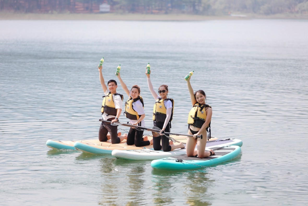 “Do ảnh hưởng khí hậu, Đà Lạt vào buổi trưa vẫn nắng hơi gắt, mình và nhóm bạn chèo thuyền Sup, ăn bánh, uống Trà Xanh Không Độ để giải nhiệt cuộc sống. Kỳ nghỉ tuy ngắn ngày nhưng thật tuyệt vời, thú vị”, Linh chia sẻ.