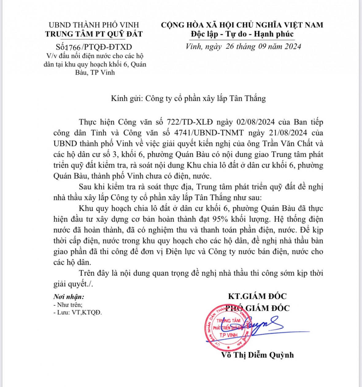 Liên quan đến giải quyết kiến nghị của người dân, sau khi có Công văn số 722 ngày 02/8/2024 của Ban tiếp công dân tỉnh Nghệ An và Công văn số 474 của thành phố Vinh, Trung tâm đã có Công văn số 1766 ngày 26/9 đề nghị Cty CP xây lắp Tân Thắng với nội dung: Hệ thống điện, nước đã hoàn thành, đã có biên bản nghiệm thu và thanh toán phần điện, nước. Để kịp thời cấp điện nước trong quy hoach cho các hộ dân, đề nghị nhà thầu bàn giao phần đã thi công để đơn vị điện lực và công ty nước bán điện, nước cho các hộ dân. Đây là nội dung quan trọng đề nghị nhà thầu thi công sớm kịp thời giản quyết.